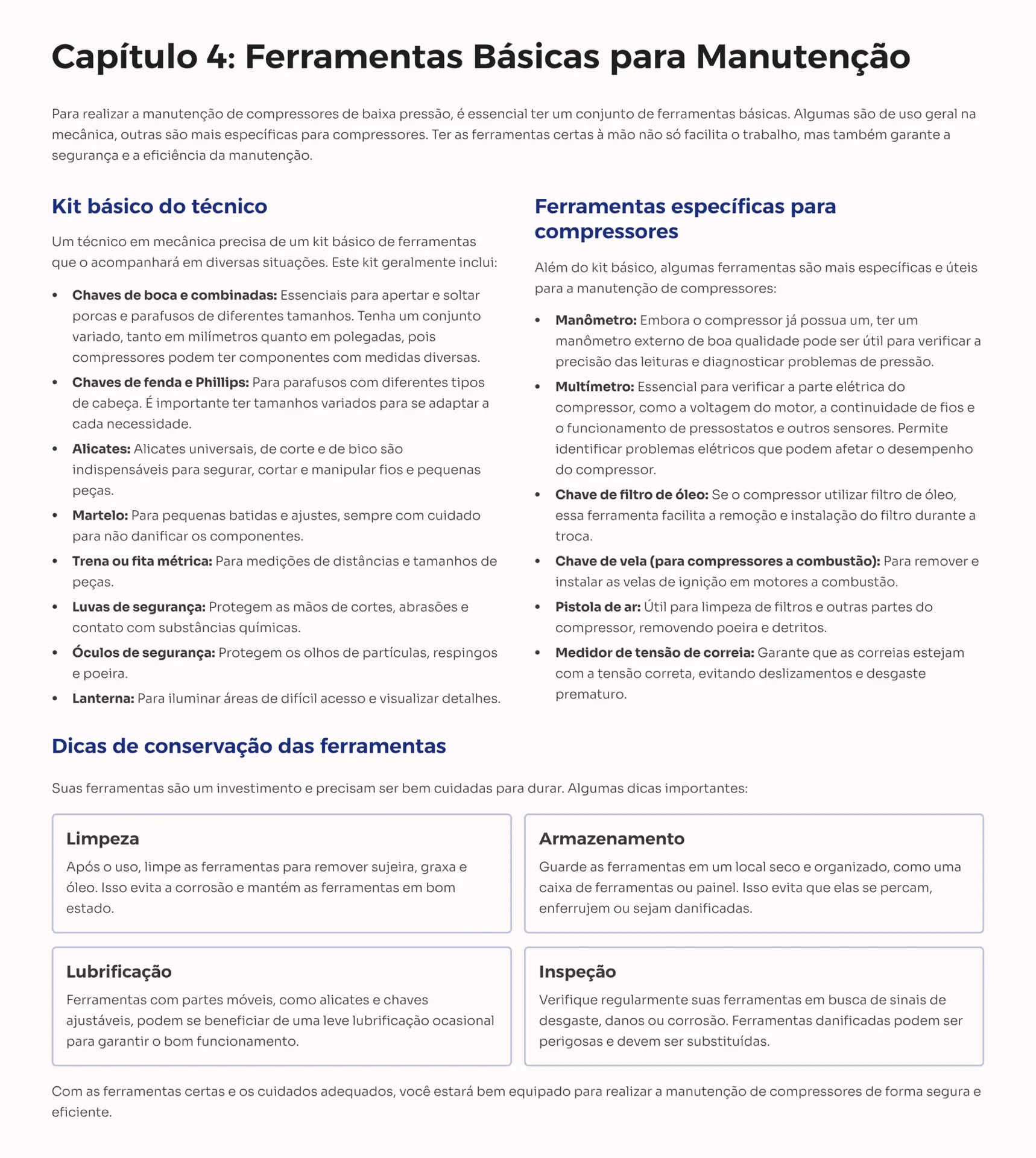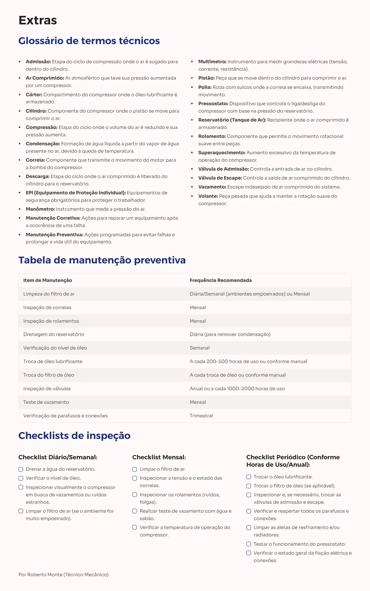 - Manutenção Preventiva Passo a Passo: Aprenda a realizar a limpeza de filtros, inspeção de correias, troca de óleo e testes de funcionamento para prolongar a vida útil do seu equipamento.